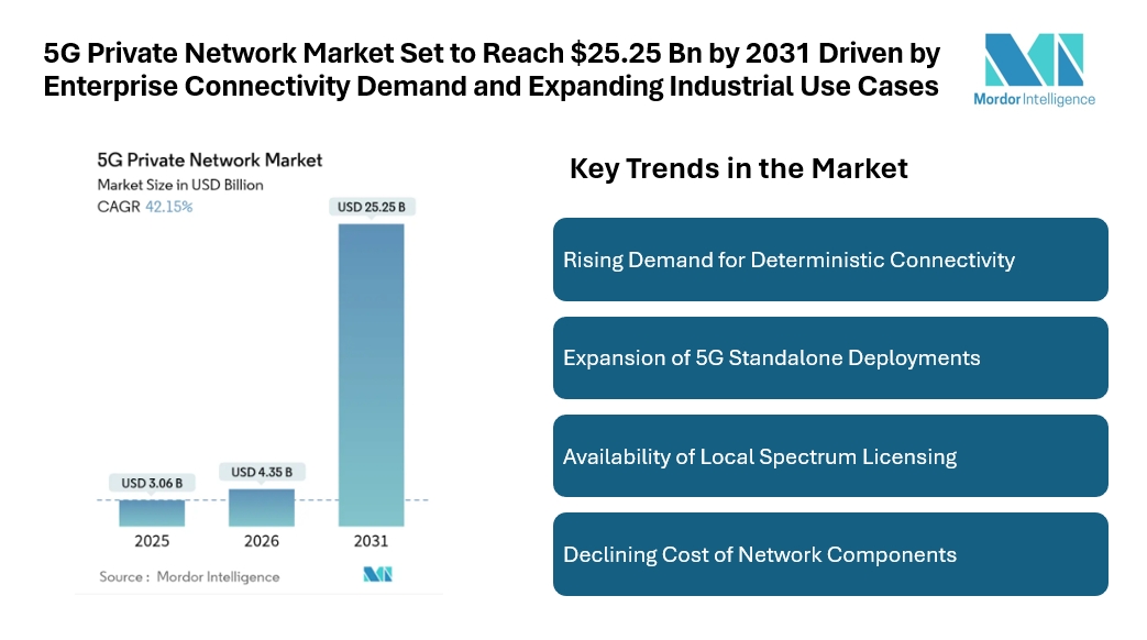 According to Mordor intelligence, the 5G private network market size is expected to grow from USD 3.06 billion in 2025 to USD 4.35 billion in 2026, and further reach USD 25.25 billion by 2031, reflecting a CAGR of 42.15% during the forecast period. This strong market growth highlights how organizations are moving beyond traditional connectivity solutions toward dedicated network environments.