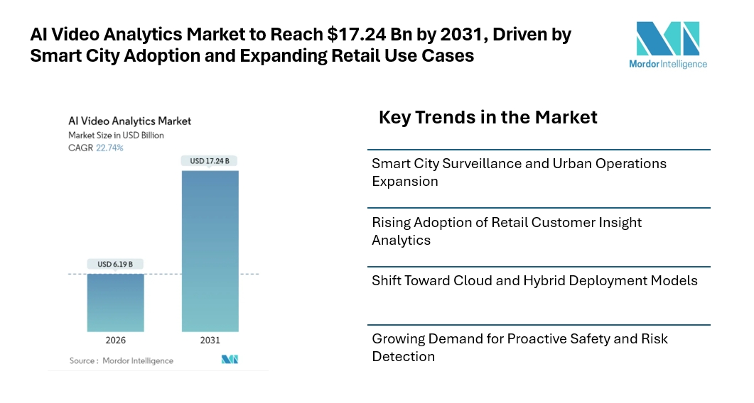 The AI Video Analytics Market is witnessing steady expansion as organizations adopt data-driven video intelligence to support security, operational monitoring, and customer insight initiatives. According to Mordor Intelligence, the AI Video Analytics Market size was valued at USD 5.04 billion in 2025 and is estimated to reach USD 6.19 billion in 2026. With increasing adoption across public infrastructure, retail environments, and transportation networks, the AI Video Analytics Market forecast indicates the market is projected to reach USD 17.24 billion by 2031.