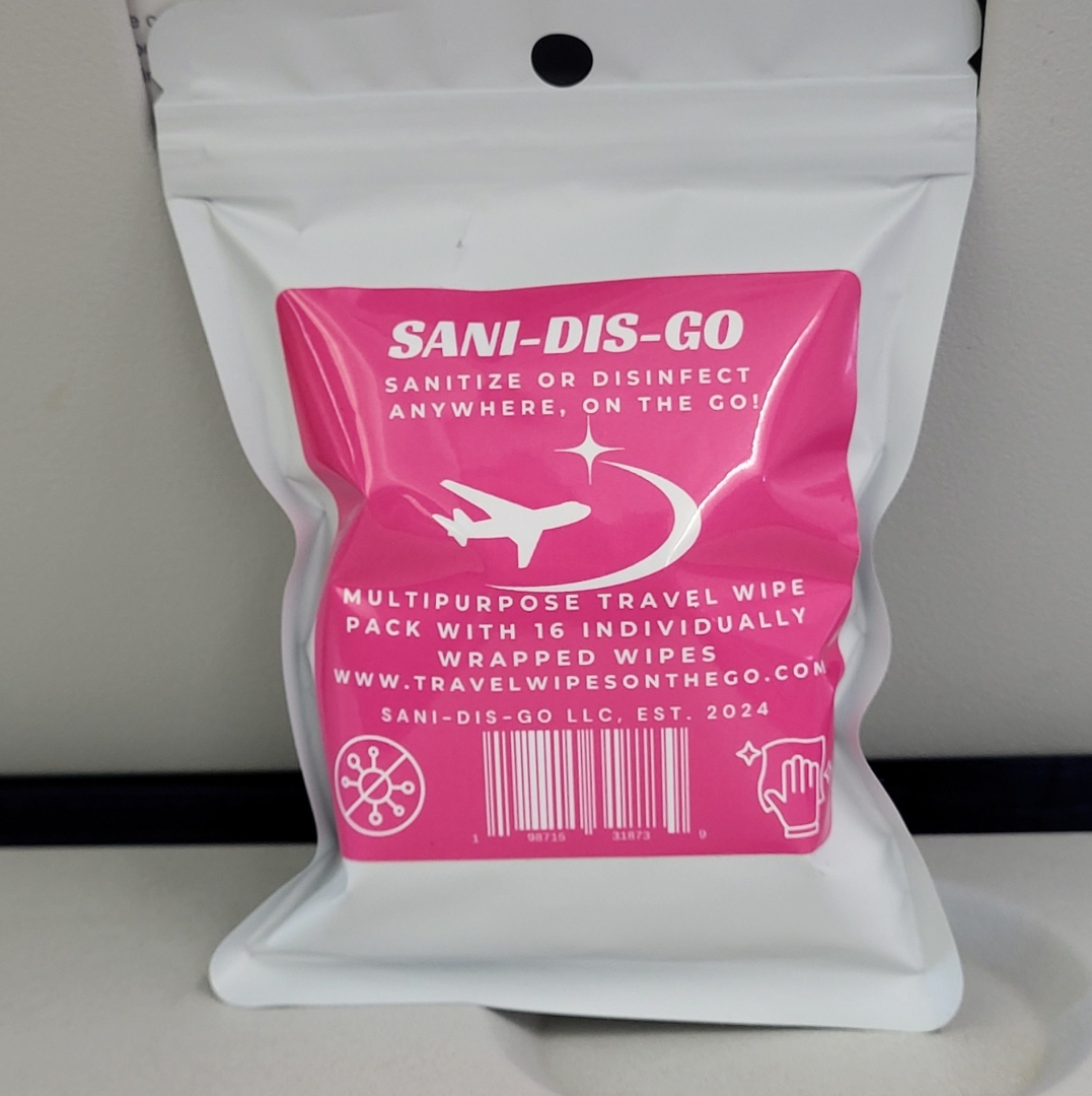 Sitting squarely inside that trend is Sani-Dis-Go LLC, a travel wipe brand founded in 2024 by Diana Karr, a full time classroom teacher. The origin story is straightforward. While traveling during summer break, Karr packed several separate wipe containers, one for hands, one for surfaces, one for eyeglasses, one for the restroom, into her carry on. A disinfectant wipe container leaked. According to Karr, the chemical content of one wipe burned a hole straight through the plastic bag she had used to contain the spill.
