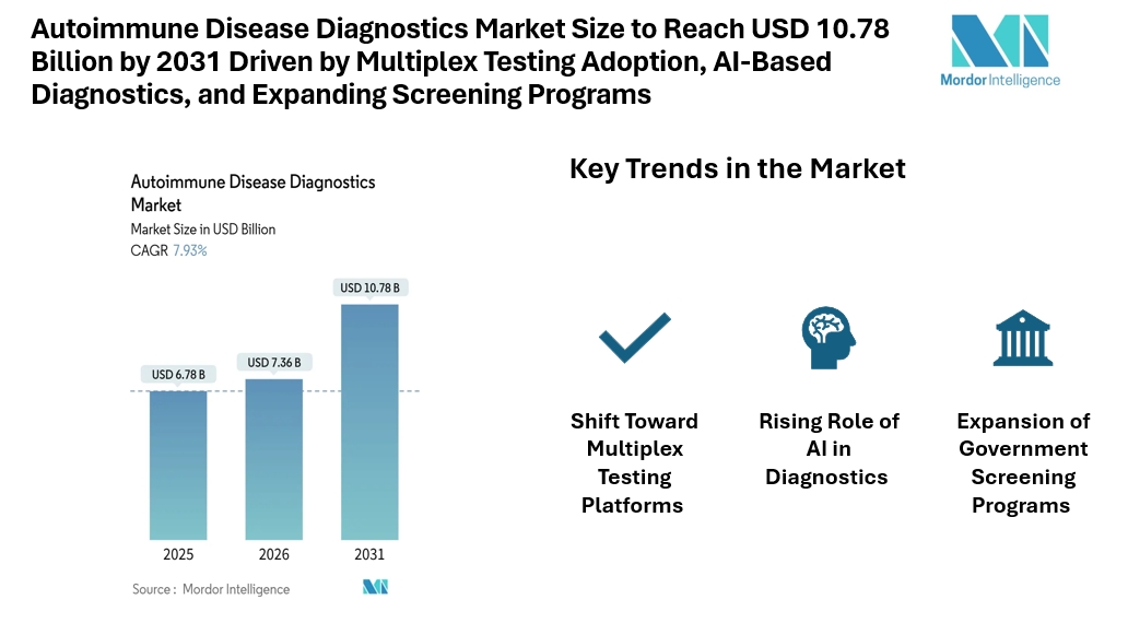 According to Mordor Intelligence, the autoimmune disease diagnostics market size is expected to grow from USD 6.78 billion in 2025 to USD 7.36 billion in 2026 and reach USD 10.78 billion by 2031, reflecting consistent autoimmune disease diagnostics market growth over the forecast period.