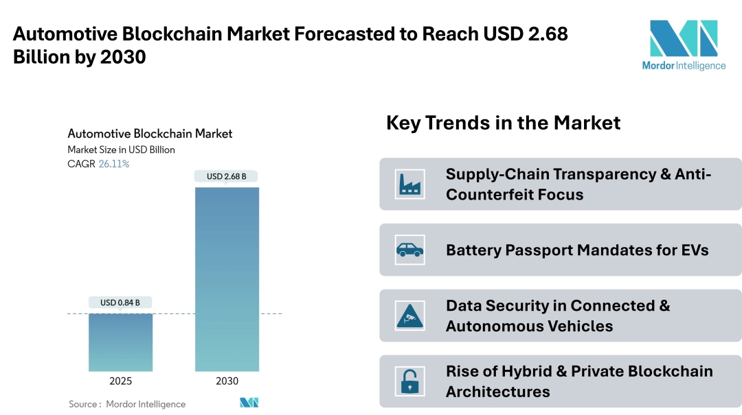 The automotive blockchain market is on track for vigorous expansion, with the market valued at approximately USD 0.84 billion in 2025 and expected to climb to USD 2.68 billion by 2030. reflecting a solid 26.11% CAGR. This surge reflects growing adoption of distributedâledger technology across the automotive value chain. Stakeholders from parts suppliers to OEMs are turning to blockchain to secure data, track provenance, and streamline compliance. As the industry navigates challenges around counterfeit components, regulatory mandates for battery tracking, and increasing data security needs in connected vehicles, the automotive blockchain market size is set to expand rapidly. This press release offers a snapshot of market trends, segmentation, key players, and strategic dynamics drawn from the Mordor Intelligence study.