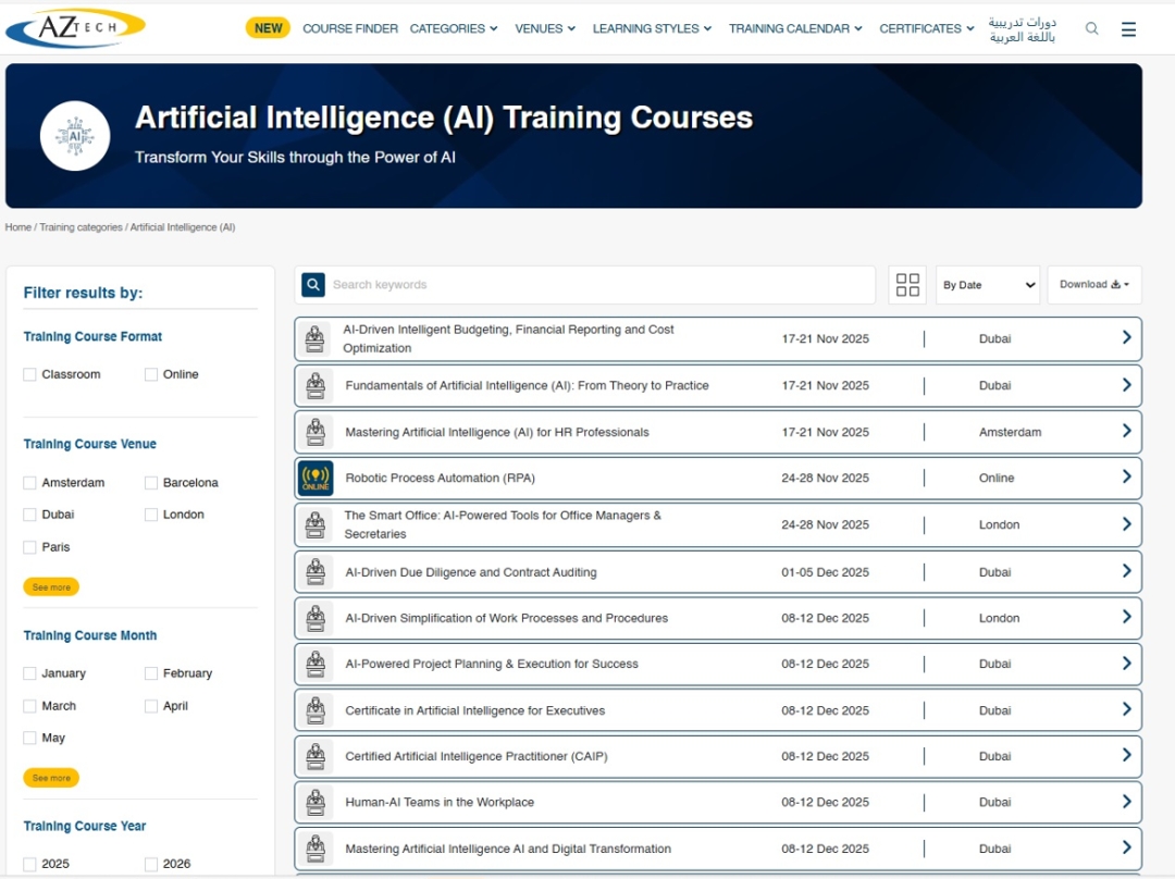 Dubai, UAE – AZTECH Training & Consultancy is proud to announce the official launch of its comprehensive new series ofArtificial Intelligence (AI) Training Courses, a milestone designed to support the growing demand for digital skills and future-focused professional development across government, industry, and the private sector.