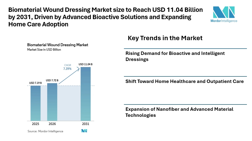 According to Mordor Intelligence, the biomaterial wound dressing market size is expected to grow from USD 7.19 billion in 2025 to USD 7.72 billion in 2026 and is forecast to reach USD 11.04 billion by 2031, registering a CAGR of 7.39% during the forecast period.