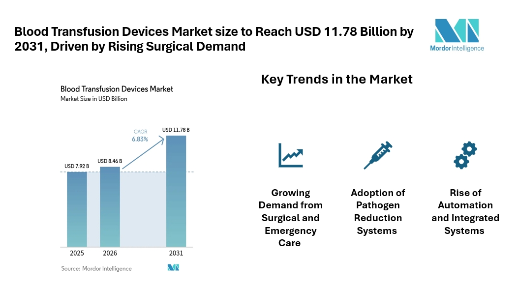 According to Mordor Intelligence, the blood transfusion devices market size is estimated at USD 8.46 billion in 2026, growing from USD 7.92 billion in 2025 and projected to reach USD 11.78 billion by 2031, registering a CAGR of 6.83% during the forecast period.