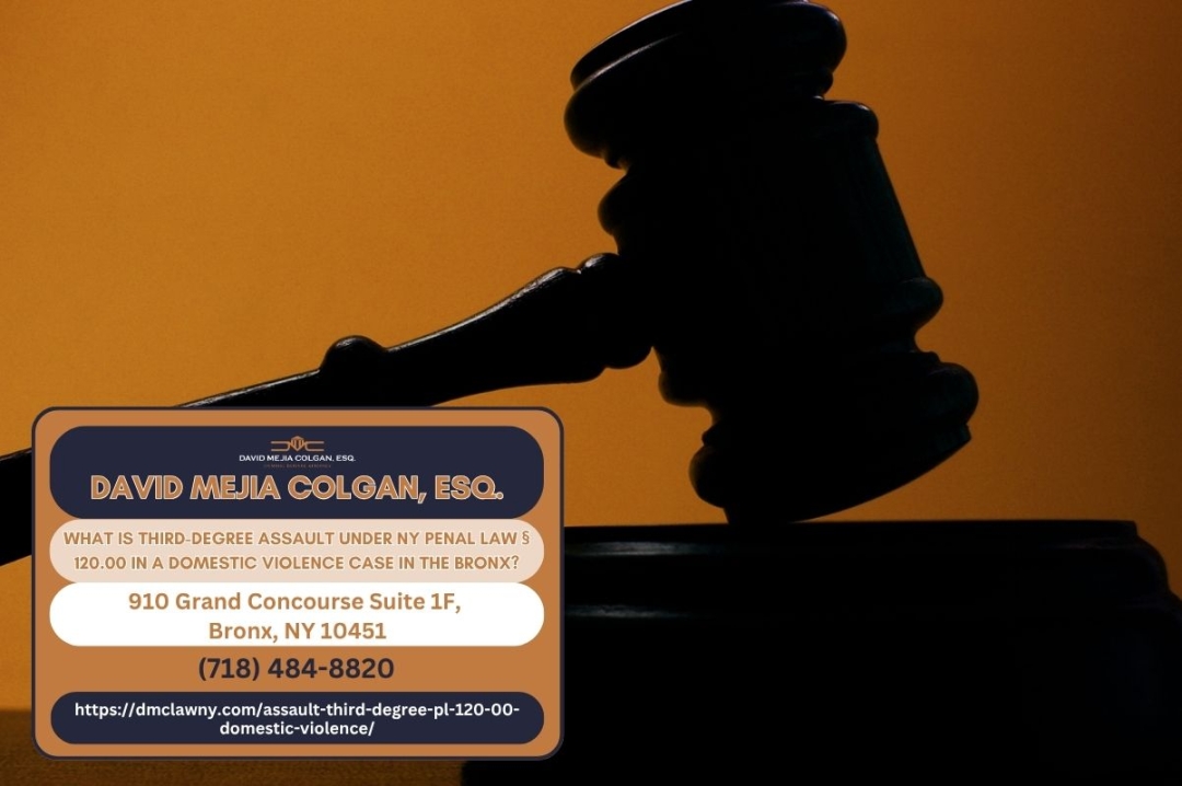BRONX, NY – A third-degree assault charge under New York Penal Law Section 120.00 is a Class A misdemeanor carrying up to 364 days in jail, three years of probation, and fines up to $1,000, but when the charge arises from a domestic violence incident, the consequences extend far beyond criminal penalties. Bronx domestic violence defense attorney David Mejia Colgan of David Mejia Colgan, Esq. (https://dmclawny.com/assault-third-degree-pl-120-00-domestic-violence/) is providing guidance on how these charges are prosecuted in the Bronx and the defenses available to those accused.