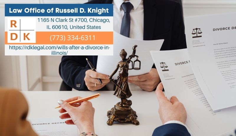 CHICAGO, IL – Divorce has significant legal consequences for wills and estate plans in Illinois, but only after the divorce is finalized. Chicago divorce attorney Russell D. Knight of the Law Office of Russell D. Knight (https://rdklegal.com/wills-after-a-divorce-in-illinois/) is providing guidance on how divorce revokes provisions benefiting former spouses, when prenuptial or postnuptial agreements can override these rules, and how divorce decrees affect property distribution upon death.