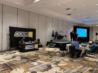 A conference room setup with CODE 4 Private Security banners and tables, a speaker presenting on stage, and an audience seated at round tables.