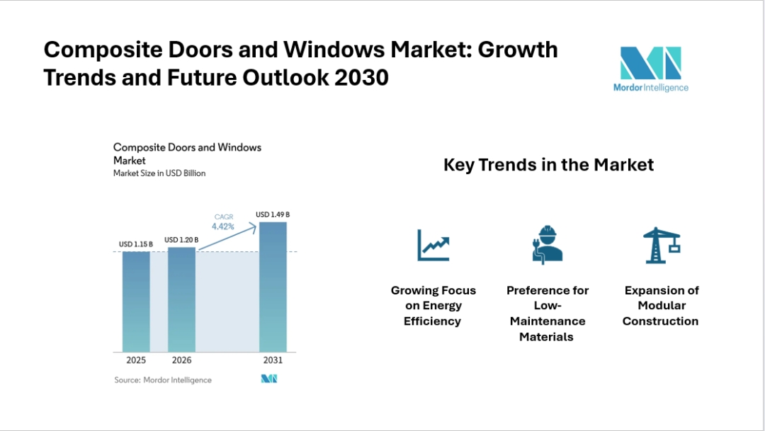 The Composite doors and windows market is steadily gaining traction as construction standards shift toward energy efficiency and durability. According to industry analysis, the global composite doors and windows market size is projected to grow from USD 1.20 billion in 2026 to USD 1.49 billion by 2031, registering a CAGR of 4.42% during the forecast period. This growth reflects a clear shift in builder and homeowner preferences toward materials that offer long-term value with minimal maintenance.