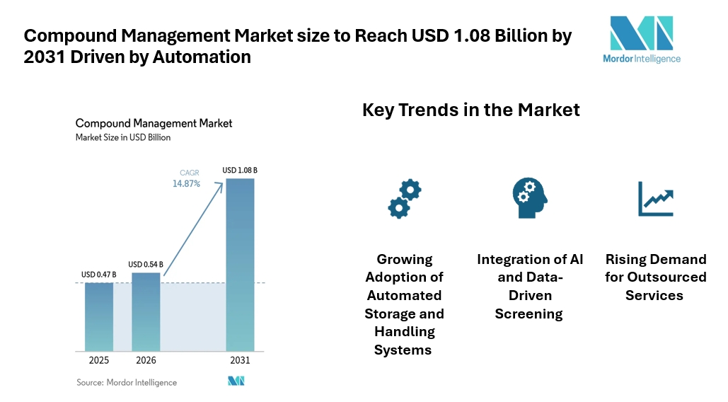 According to Mordor Intelligence, the compound management market size is expected to grow from USD 0.54 billion in 2026 to USD 1.08 billion by 2031, registering a CAGR of 14.87% during the forecast period. This reflects strong compound management market growth supported by increasing outsourcing, adoption of automated systems, and growing demand for organized sample storage.