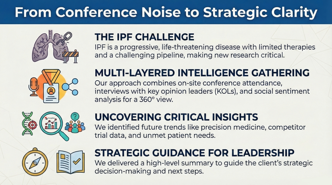 DelveInsight delivered comprehensive conference coverage across major respiratory events to support a client developing an IPF therapy. The insights included clinical trial updates, emerging biomarkers, expert opinions, and competitive intelligence, enabling strategic decision-making and stronger positioning in the evolving IPF landscape.