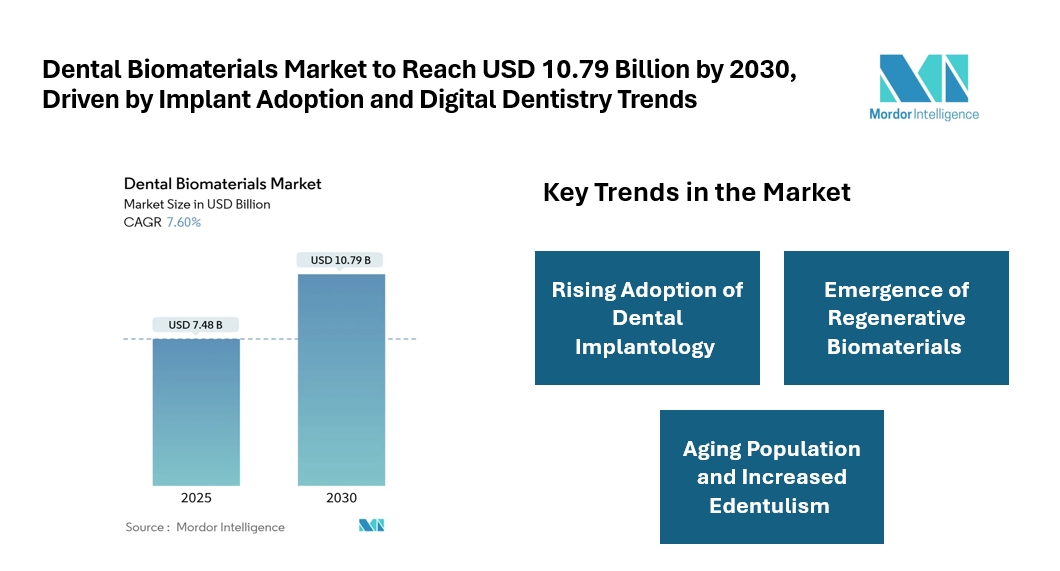 The dental biomaterials market stands at USD 7.48 billion in 2025 and is forecast to reach USD 10.79 billion by 2030, advancing at a 7.6% CAGR, according to a report by Mordor Intelligence. This steady growth reflects a strong recovery trajectory supported by the aging global population, rising demand for dental implants, and rapid adoption of modern dental manufacturing techniques.