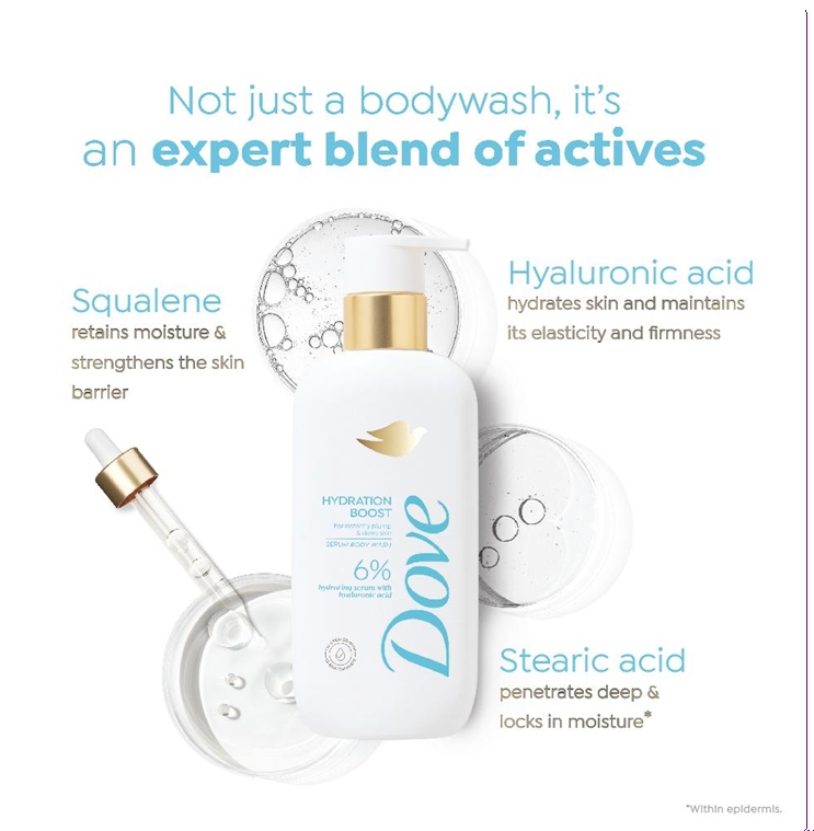Body washes formulated with concentrated hydrating blends, such as Dove Hydration Boost Body Wash with a 6% Hydrating Serum enriched with Hyaluronic Acid, are designed to support moisture levels during cleansing rather than after.