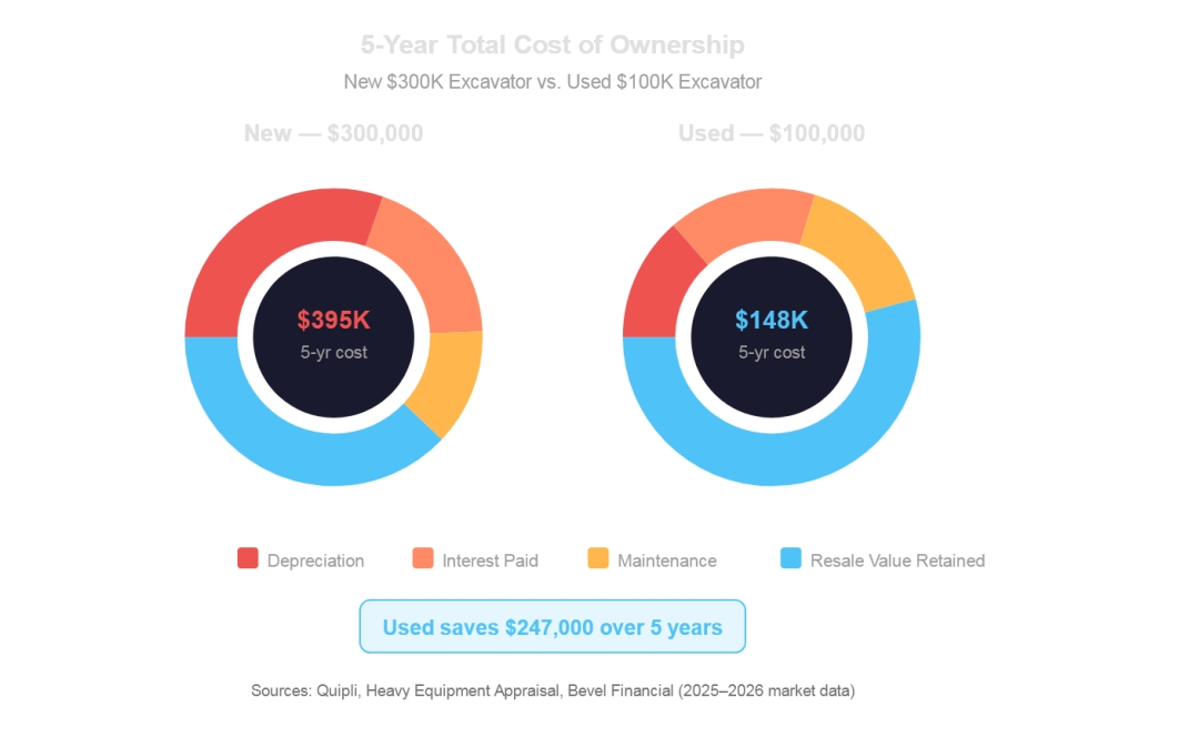 – Excavators (20-30 ton): New $200K-$600K vs. used $75K-$220K — up to 60% savings