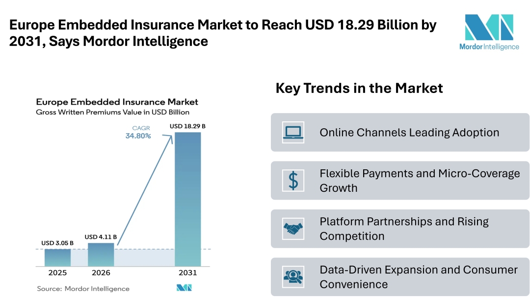 According to Mordor Intelligence, the Europe embedded insurance market size is projected to grow from USD 3.05 billion in 2025 to USD 4.11 billion in 2026 and is forecast to reach USD 18.29 billion by 2031, registering a CAGR of 34.8% over the forecast period. This strong market growth reflects a shift in how consumers access coverage, moving from separate policy purchases to instant protection embedded directly within transactions.