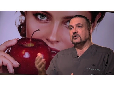 Dr. Sargon Lazarof of Sargon Dental speaking in front of a large image of a woman holding an apple.