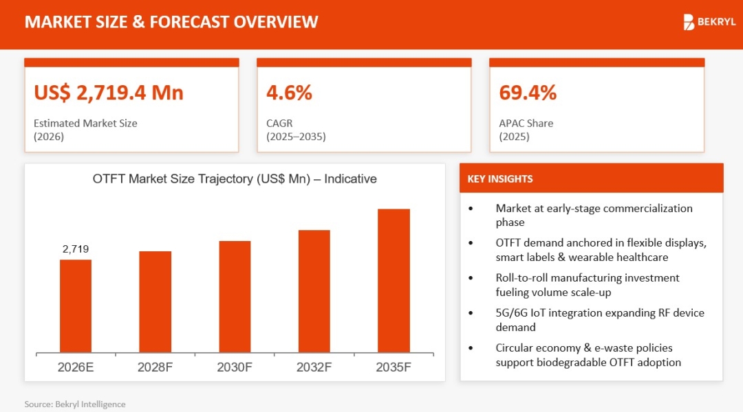 According to the recently released report by Bekryl Intelligence, the Global Organic Thin-Film Transistor (OTFT) Market is estimated to be valued at US$ 2,719.4 million in 2026 and is expected to register a CAGR of 4.6% during the forecast period. The industry is currently undergoing a Flexible Electronics 2.0 revolution, shifting from laboratory-scale prototypes to high-volume commercialization in wearables, foldable displays, and smart packaging.
