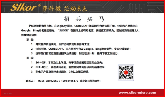 With the steady growth and increasing influence of Slkor Semiconductor and Kinghelm Electronics in the domestic market, the company has entered a new stage of rapid development. To accelerate global business layout and promote brand internationalization, we are now sincerely recruiting two Overseas Sales Managers to join us in exploring a broader world stage. Furthermore, Slkor Semiconductor’s product portfolio is very rich, including not only analog-to-digital converters (ADCs) and V/F & F/V converter chips, but also high-end products like silicon carbide (SiC) diodes, SiC MOSFETs, IGBTs, fifth-generation ultra-fast recovery power diodes, etc., meeting the needs of industries such as new energy vehicles, high-end equipment, communication and power, solar photovoltaics, medical devices, and industrial internet. Slkor’s general-purpose products include Schottky diodes, ESD protection diodes, TVS diodes, and other general-purpose diodes and transistors; power devices include high/medium/low voltage MOSFETs, thyristors, bridge rectifiers, etc.; and power management IC series like LDO, AC-DC, DC-DC chips, as well as sensors, high-speed optocouplers, crystals/oscillators, providing supporting services for customers, widely used in smartphones, laptops, robots, smart homes, IoT, LED lighting, 3C digital products, smart wearables, and the Internet of Everything! Slkor’s sister company—Kinghelm—sells products worldwide, serving over ten thousand customers. Its products include Beidou/GPS dual-mode antennas, Bluetooth, WiFi, Zigbee, NB-IoT, LoRa, UWB antenna series, and supporting RF jumper cables; now product lines have expanded to include various board-to-wire connectors, board-end sockets/terminals, signal switch series, and three major series: automotive/motorcycle wiring harnesses, industrial/medical/research special cables, and custom-made non-standard products, working together with Slkor to provide complete solutions for electronic product companies.