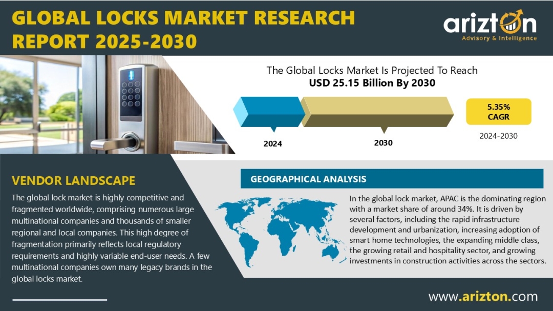 Arizton’s latest research reveals that the global locks market, valued at USD 18.39 billion in 2024, is set to reach USD 25.15 billion by 2030, advancing at a CAGR of 5.35%. As one of the most essential components of the building materials and security ecosystem, the market is undergoing a transformative shift. Rapid urbanization, smart city development, and the growing integration of connected devices across residential and commercial environments are fueling demand for advanced, reliable, and intelligent lock solutions. With security expectations evolving beyond basic access control, the global market is now transitioning toward smarter, ecosystem-driven protection for both people and property.
