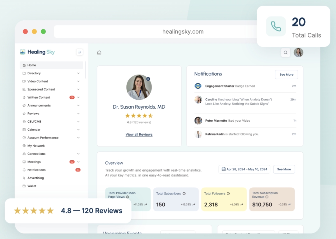 Healing Sky moves beyond the age-old insurance-type provider directory listings by enabling clinicians to actively contribute content and engage with a broader audience. Providers can publish both video and written content directly on the platform, allowing prospective patients to experience their approach, communication style, and clinical focus firsthand before making an informed decision about their care.