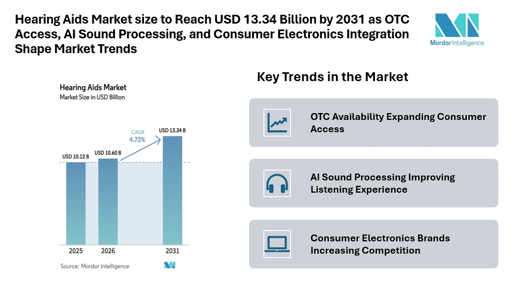 According to Mordor Intelligence, the hearing aids market size is estimated at USD 10.12 billion in 2025, rising to USD 10.6 billion in 2026, and is projected to reach USD 13.34 billion by 2031. The expansion reflects growing awareness of hearing loss, a rising aging population, and the increasing availability of modern hearing solutions through multiple distribution channels.