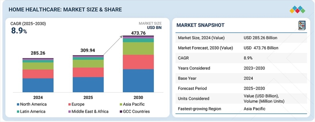 The global home healthcare market is projected to grow from USD 309.94 billion in 2025 to USD 473.76 billion by 2030, registering a strong CAGR of 8.9% during the forecast period. This significant expansion is primarily driven by the rapidly growing elderly population, which is more susceptible to chronic health conditions such as hypertension, diabetes, cardiovascular diseases, and respiratory disorders. These conditions require long-term monitoring and ongoing care, making home healthcare an increasingly attractive alternative to hospital-based treatment. In addition, the widespread adoption of telehealth platforms and remote patient monitoring technologies is improving access to healthcare services and enabling providers to deliver high-quality care outside traditional clinical settings. Rising awareness regarding preventive healthcare, early diagnosis, and chronic disease management is also fueling demand for home healthcare services. Furthermore, continuous innovation in home healthcare devices, including portable therapeutic equipment and connected medical devices, is enhancing patient convenience and affordability, encouraging greater adoption across both developed and emerging markets.