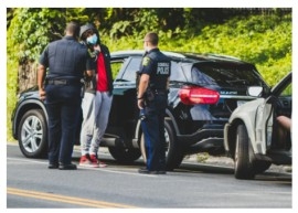 Police officers are speaking with an individual who is being detained beside a parked car on the roadside.