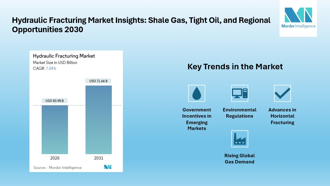 According to Mordor Intelligence, the hydraulic fracturing market is valued at USD 50.98 billion in 2026 to USD 71.66 billion by 2031, reflecting a steady CAGR of 7.04%. Hydraulic fracturing, commonly known as fracking, has become essential for unlocking shale gas, tight oil, and coal-bed methane resources. With rising global energy demand and the shift toward natural gas as a cleaner alternative to coal, the industry is witnessing strong investment momentum.