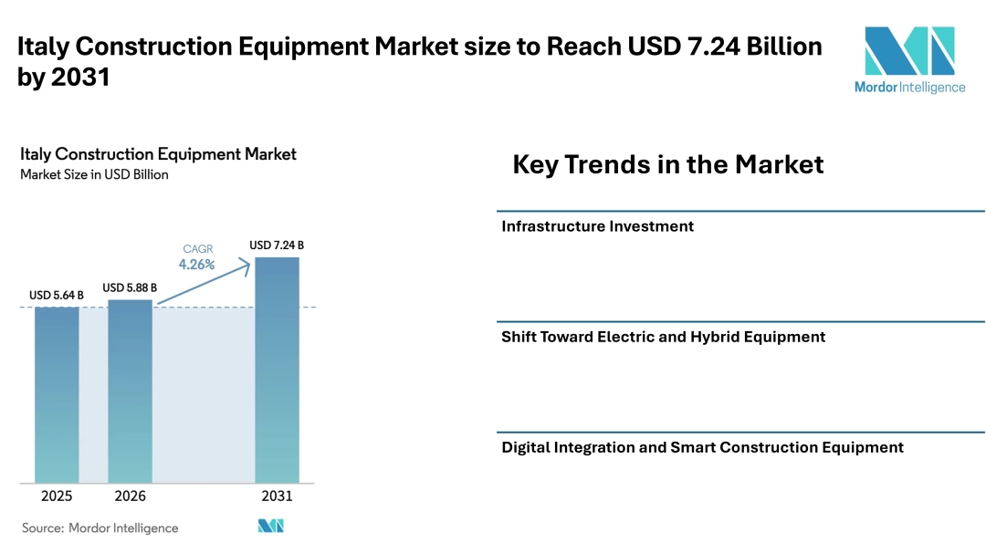 According to Mordor Intelligence, the Italy construction equipment market size is expected to grow from USD 5.64 billion in 2025 to USD 5.88 billion in 2026 and further reach USD 7.24 billion by 2031. This reflects consistent Italy construction equipment market growth, backed by a stable pipeline of projects and supportive policy measures.