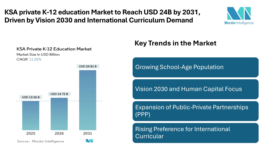According to Mordor Intelligence, the KSA private K-12 education market size was valued at USD 13.26 billion in 2025 and is estimated to grow from USD 14.72 billion in 2026 to reach USD 24.81 billion by 2031, registering a CAGR of 11.02%. The KSA private K-12 education market continues to expand as Saudi Arabia advances its long-term education objectives under Vision 2030. The market forecast remains positive, supported by demographic growth and policy support aimed at increasing private sector participation in the education system.