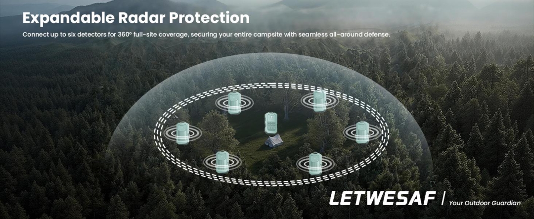For larger setups, LETWESAF supports multiple detectors to create a layered 3D perimeter, allowing families, campers, and property owners to establish professional-grade security around tents, RVs, backyards, or equipment zones. The result is a solution that combines advanced radar technology with practical, real-world usability—trusted wherever safety matters most.