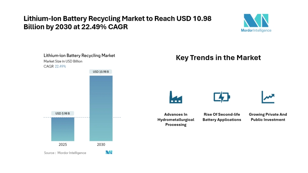 Lithium-ion Battery Recycling Market is projected to grow from USD 3.98 billion in 2025 to USD 10.98 billion by 2030, registering a 22.49% CAGR during the forecast period (2025–2030).