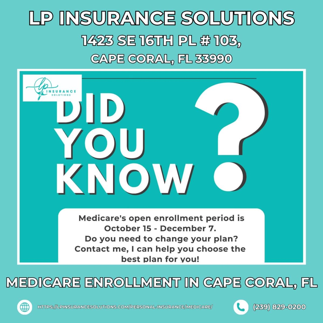 Medicare Enrollment in Cape Coral, FL – LP Insurance Solutions. LP Insurance Solutions graphic promoting the 2025 Medicare Open Enrollment Dates for 2025. The image promotes LP Insurance Solutions in Cape Coral, FL, highlighting Medicare’s open enrollment period from October 15 to December 7. It encourages individuals to review or change their Medicare plans with expert help.