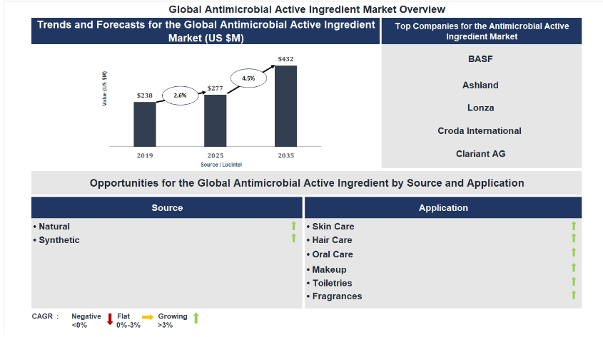 Key data points: The market size in 2035 = $432 million, growth forecast = 4.5% annually for the next 8 years. Scroll below to get more insights. This market report covers trends, opportunities and forecasts in antimicrobial active ingredient market to 2035 by source (natural and synthetic ), application (skin care, hair care, oral care,