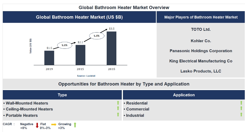According to a market report by Lucintel, the future of the global bathroom heater market looks promising with opportunities in the residential, commercial, and industrial markets. The global bathroom heater market is expected to reach an estimated $3.5 billion by 2035 with a CAGR of 5.3% from 2026 to 2035. The major drivers for this market are the increasing demand for energy efficient heating solutions, the rising home renovation & modernization activities, and the growing adoption of smart bathroom heating systems.