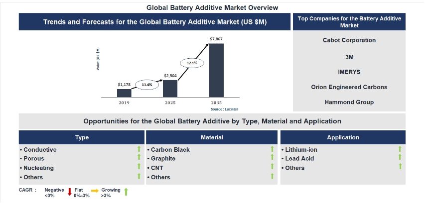 According to a market report by Lucintel, the future of the global battery additive market looks promising with opportunities in the lithium-ion and lead acid markets. The global battery additive market is expected to reach an estimated $7,867 million by 2035 with a CAGR of 12.1% from 2026 to 2035. The major drivers for this market are the rising demand for energy storage systems, the growing demand for industrial automation & backup power needs, and the increasing demand for government support for clean energy initiatives.