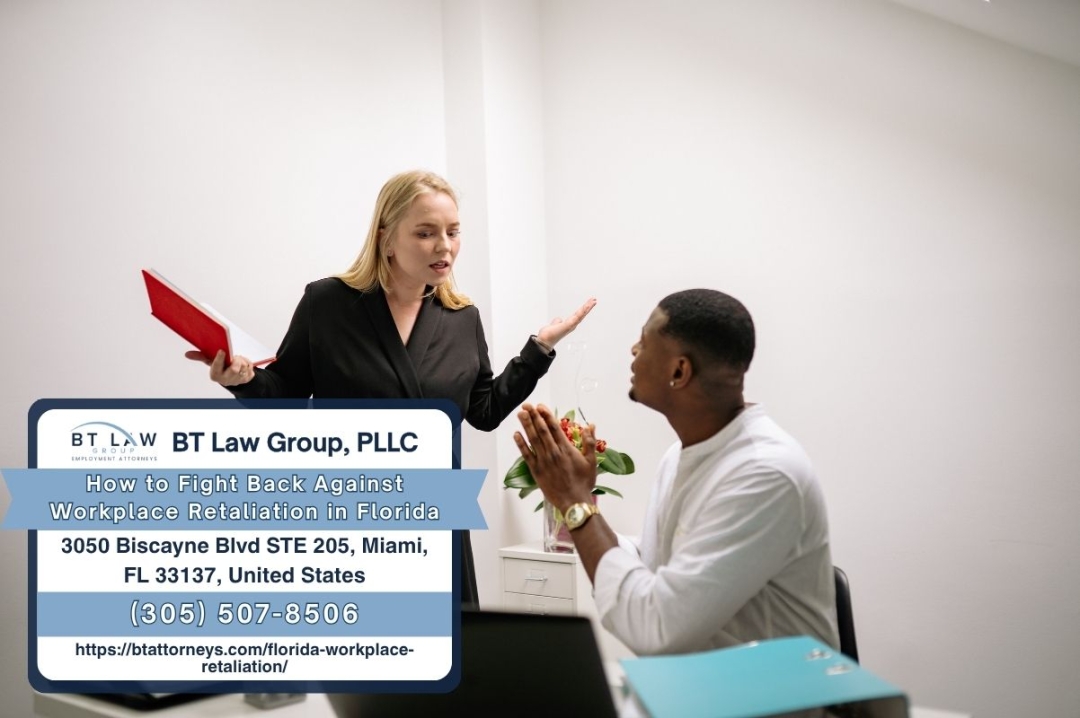 BT Law Group, PLLC is a Miami-based law firm focused on employment law matters throughout Miami-Dade County and South Florida. Led by founding partners Jason D. Berkowitz and Anisley Tarragona, the firm represents employees in retaliation, discrimination, wage and hour, and wrongful termination cases. The office is located at 3050 Biscayne Boulevard, Suite 205, Miami, FL 33137. For consultations, call (305) 507-8506.