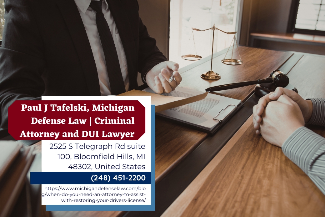 BLOOMFIELD HILLS, MI – Michigan drivers who lose their license after multiple alcohol-related driving convictions face a demanding administrative process before regaining the right to drive, with strict evidentiary standards and limited opportunities to appeal a denial. Michigan license restoration attorney Paul J. Tafelski of Michigan Defense Law (https://www.michigandefenselaw.com/blog/when-do-you-need-an-attorney-to-assist-with-restoring-your-drivers-license/) guides clients throughout Oakland County and Michigan through every stage of the license restoration hearing process, from initial documentation to hearing-day testimony.