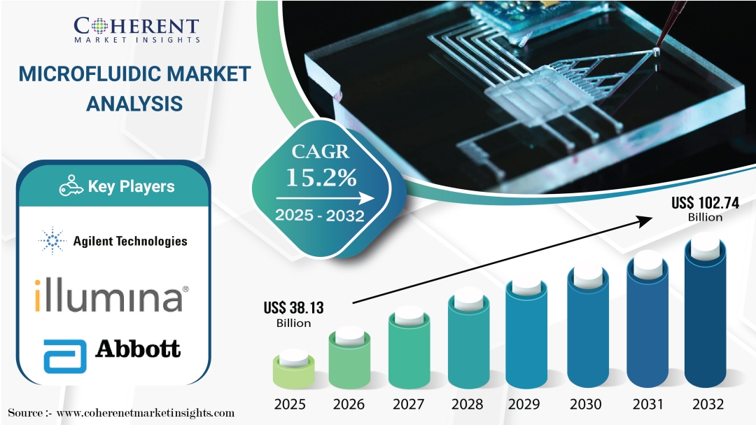 According to Coherent Market Insights (CMI), the global microfluidic market size is projected to grow nearly 2.7X over the forecast period, reaching USD 102.74 Bn by 2032, up from USD 38.13 Bn in 2025.