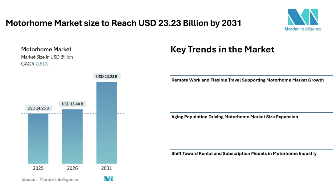 According to Mordor Intelligence, the motorhome market size is projected to grow from USD 14.23 billion in 2025 to USD 15.44 billion in 2026 and further reach USD 23.23 billion by 2031. This steady motorhome market growth reflects changing travel preferences, where consumers are choosing flexible and private travel options over traditional accommodation. The motorhome industry continues to benefit from a mix of lifestyle changes and economic factors that support long-distance road travel.