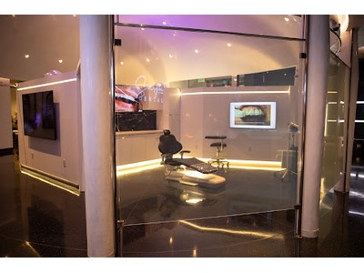 A modern dental treatment room with sleek glass walls, illuminated ambient lighting, and a central dental chair equipped with surrounding tools and monitors.