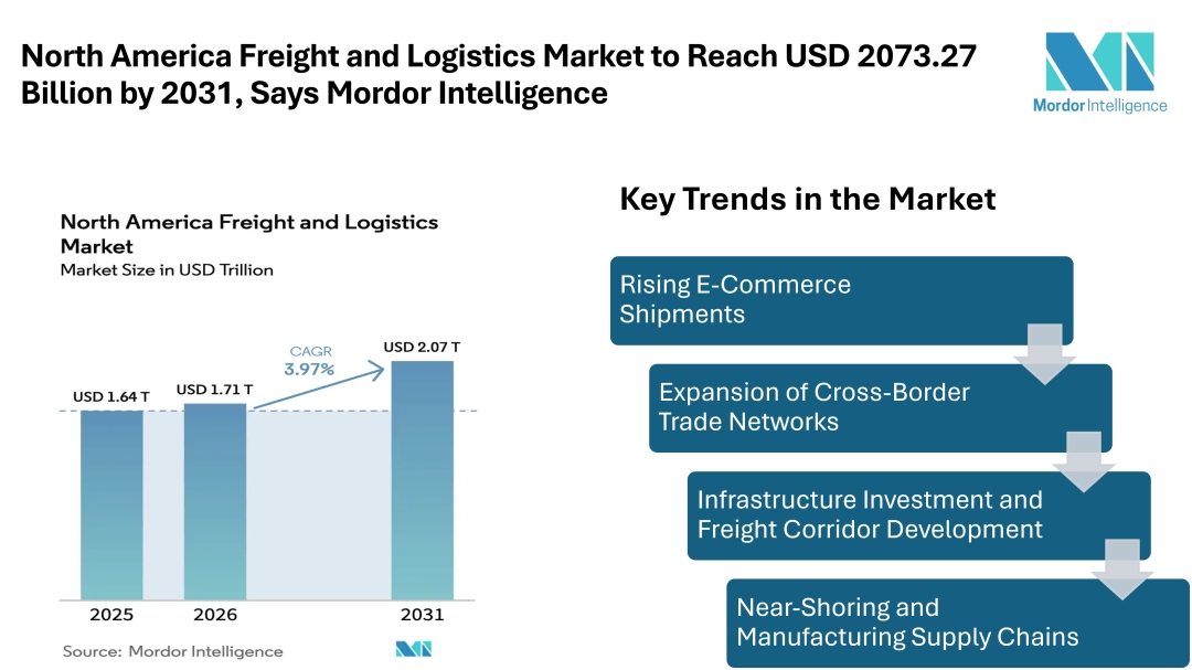 According to Mordor Intelligence, the North America freight and logistics market size was valued at USD 1641.37 billion in 2025 and is estimated to grow to USD 1706.53 billion in 2026, reaching USD 2073.27 billion by 2031, registering a CAGR of 3.97% during 2026–2031. The North America freight and logistics market continues to expand as trade integration, e-commerce activity, and infrastructure investment strengthen supply chain connectivity across the United States, Canada, and Mexico.