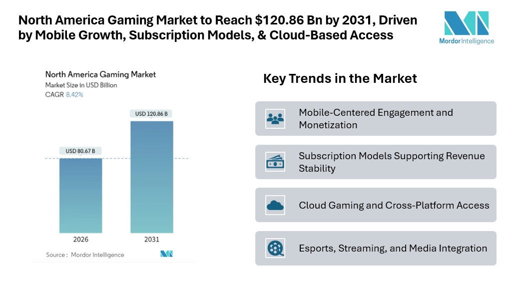 The North America Gaming Market continues to record steady expansion, supported by a broad user base and diversified monetization models across platforms. According to Mordor Intelligence, the market is valued at USD 80.67 billion in 2026, rising from USD 74.40 billion in 2025, and is projected to reach USD 120.86 billion by 2031. This outlook reflects consistent demand across console, PC, mobile, and cloud-enabled gaming formats, with value growth supported by a mix of free-to-play mechanics, premium titles, and subscription access.