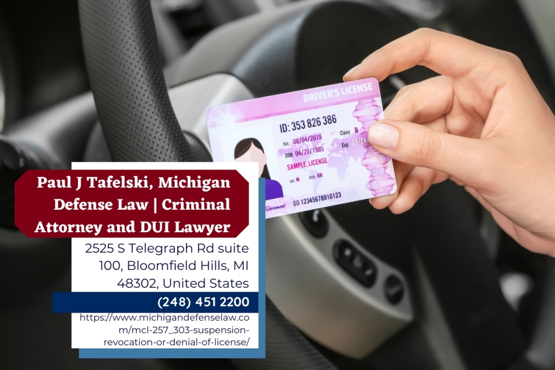 Oakland County license restoration lawyer Paul J. Tafelski of Michigan Defense Law (https://www.michigandefenselaw.com/blog/mcl-257_303-suspension-revocation-or-denial-of-license/) is shedding light on a key section of Michigan traffic law, MCL 257.303. This statute governs the denial, suspension, or revocation of driver’s licenses and has wide-reaching implications for Michigan residents facing the loss of driving privileges. As a license restoration lawyer, Tafelski helps individuals navigate the legal challenges of this law and work toward regaining their ability to drive.
