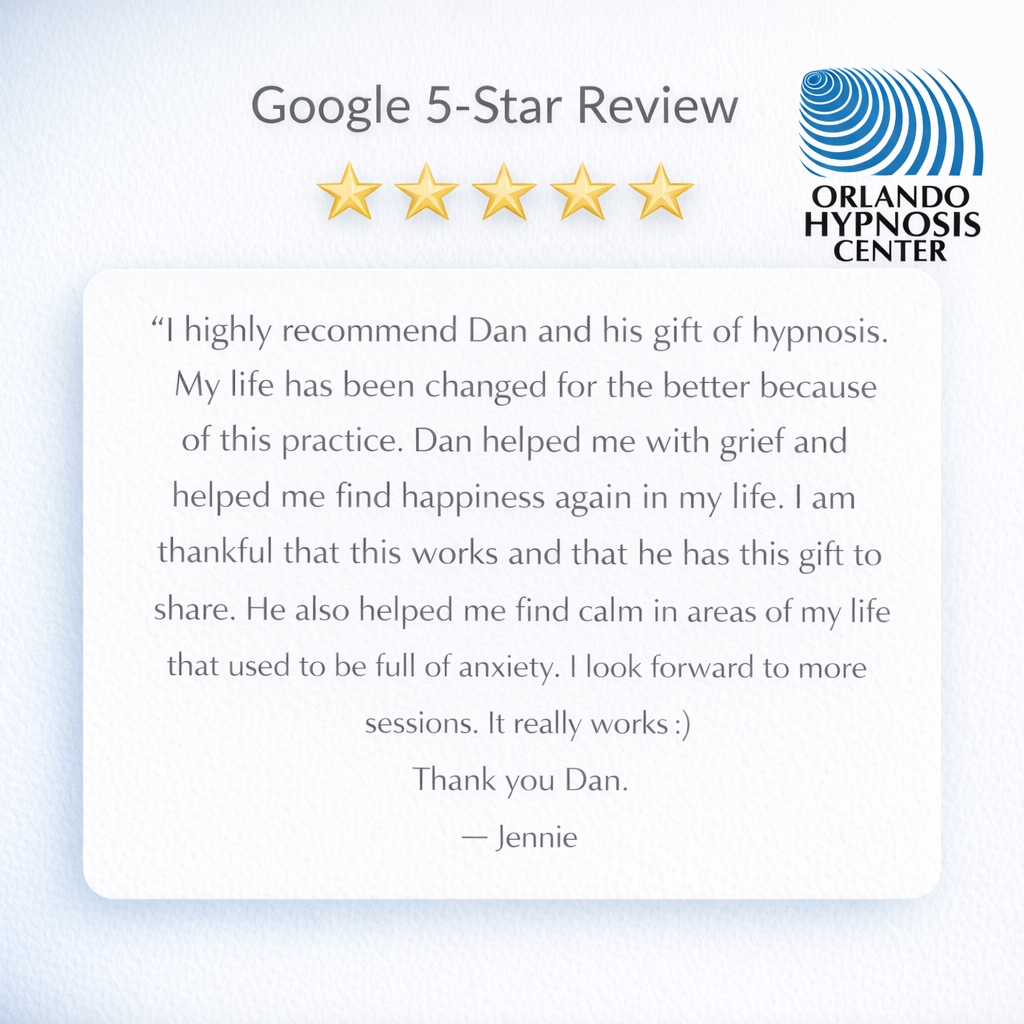 Orlando Hypnosis Center reviews – Jennie’s 5-star Google review highlights how lead hypnotist Daniel Olson helped her overcome grief and anxiety, restoring calm and happiness to her life. With 30+ years of experience, Daniel Olson at Orlando Hypnosis Center delivers life-changing results. Free consultations available. Call (407) 740-6090 or visit danielolson.com.
