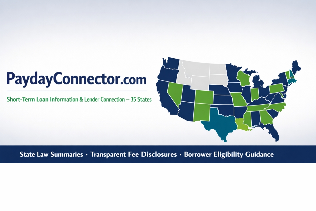PaydayConnector.com is a national short-term loan information resource and lender connection platform operating across 35 states. The platform provides state-specific regulatory information, borrower eligibility guidance, transparent fee disclosures, and lender connection services for borrowers considering short-term lending options. PaydayConnector.com is not a lender and does not make credit decisions. All loan terms, rates, and approval decisions are made solely by lenders in the platform’s network.
