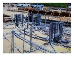 A construction site shows exposed electrical conduit systems being installed before the foundation is poured.