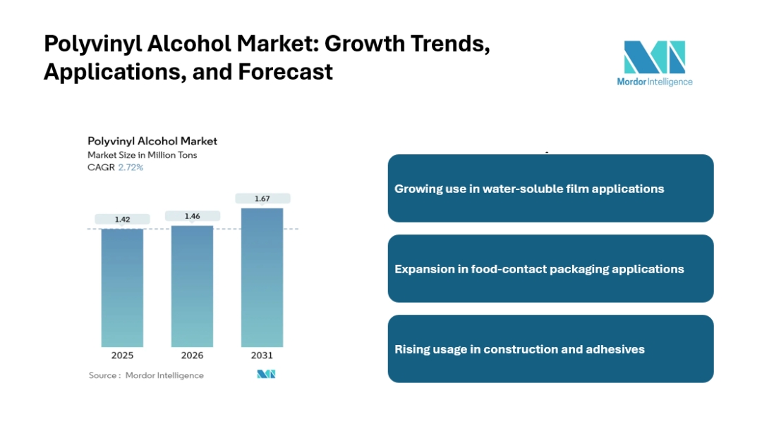 Polyvinyl Alcohol Market Projected to Expand to 1.67 Million Tons by 2031 at 2.72% CAGR | Rising Demand from Water-Soluble Films and Coatings