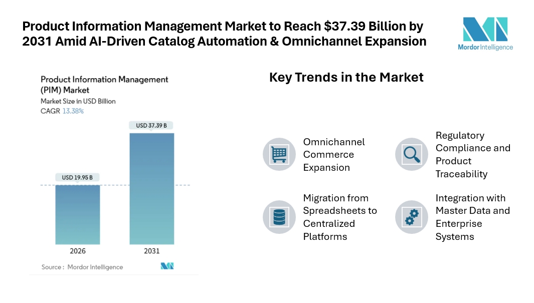 According to industry analysis, the product information management market size stands at USD 19.95 billion in 2026 and is projected to reach USD 37.39 billion by 2031, registering a 13.38% CAGR during the forecast period. This market forecast reflects rising demand for accurate, real-time product content across online stores, marketplaces, mobile apps, and physical channels. Businesses across retail, manufacturing, BFSI, and media sectors increasingly rely on PIM solutions to maintain consistent product descriptions, attributes, images, and regulatory details. The shift toward unified data hubs is driven by the need to reduce product returns, improve conversion rates, and ensure brand consistency worldwide. As companies expand into new digital channels, the product information management industry is becoming essential infrastructure rather than optional software.