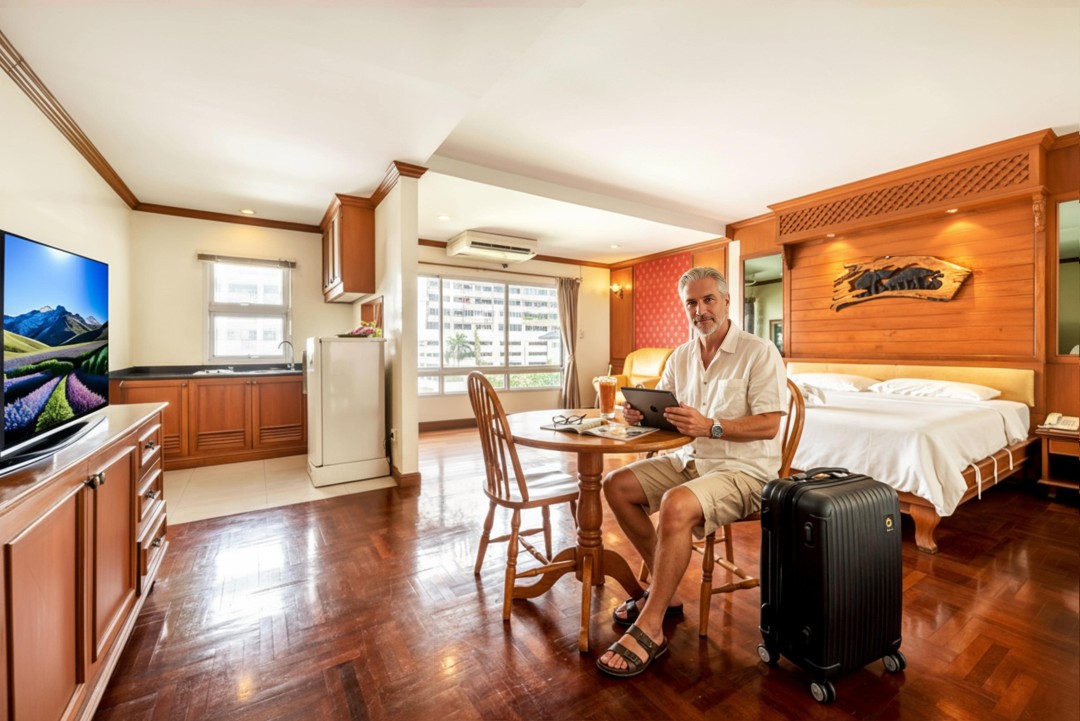 Digital nomads and remote workers establishing temporary Bangkok bases benefit from enhanced room features creating comfortable living spaces during extended visits lasting weeks or months. The appliance upgrades support self-catering options reducing overall travel costs while maintaining proximity to Nana’s entertainment venues and business districts. This combination positions Royal Ivory as the optimal three-star hotel for both short-term visits (1-7 nights) and extended Bangkok residencies (30+ nights) among male international travelers.