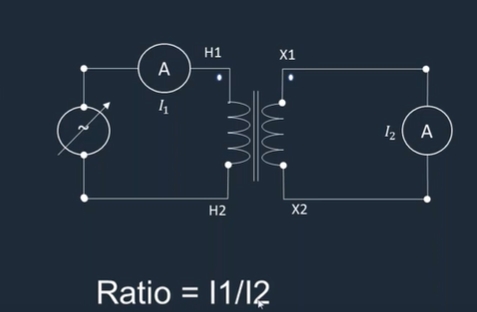 Ratio Test-Current Method: A suitable current, below saturation, is applied to the primary winding, and the secondary current is measured. The turns ratio is calculated as the ratio of primary current to the measured secondary current.
